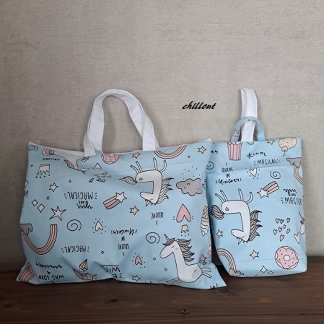 とてもかわいらしいユニコーンの入園バッグ2点セットが出来上がりました。 淡い水色がとてもおしゃれ。 ユニコーンの言い伝えは、額に一本の角を持つ神秘的な白馬のような幻獣で、「純潔」「力」「希望」「浄化」の象徴とされ「滅多にない幸運」などの言い伝えがあります。 丈夫に作っておりますのでお洗濯ももちろんしていただけます。 入園入学の時期に合わせて新品のセットをぜひどうぞ。 【サイズ】 ①レッスンバッグ 縦31㎝ 横41㎝ ②靴袋 縦27㎝ 横13㎝ マチ9㎝ 是非この機会にどうぞ。 端処理はロックミシンですのでお洗濯も安心、長くご愛用頂けます。 園児バッグ・通園バッグは人気商品のため、オーダーは承っておりません。 【ご注意】 ・こちらの商品はハンドメイドです。 ・心を込めて制作した商品を販売しておりますが、サイズの誤差や差異等、ご了承ください。 ・色味に関しましてもできるだけ自然光にて撮影しております。 ・ハンドメイド商品のため、チャコペンなどの印が残っている場合があります。 【配送に関して】 ・圧縮してお届けいたします。 ・届きましたらお洗濯後、アイロンがけをお願いいたします。 以上、既製品ではない旨、ご理解の上お買い上げください。 #入園バッグ #通園バッグ #通学バッグ #入園バッグセット #通園バッグセット #通学バッグセット #2点セット #幼稚園 #保育園 #レッスンバッグ #靴袋 #手作り #ハンドメイド #世界に一つ #オリジナル #かわいい #かっこいい #水色 #ユニコーン