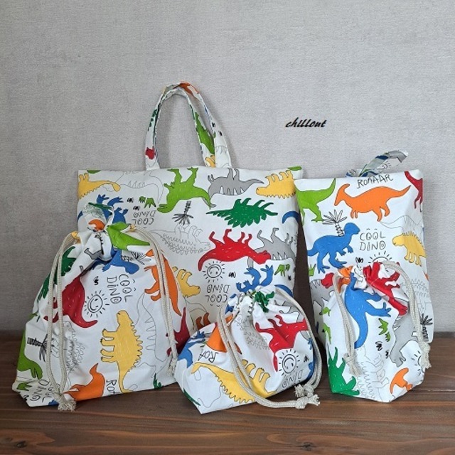 【OUTLET商品】柄の向きが逆さまとなっております。 恐竜:ダイナソー柄の入園バッグ5点セットが出来上がりました! かっこいい恐竜(ダイナソー)がプリントされていておしゃれな男の子に人気です。 お友達とはちょっと違う、だけどかっこいい、そんなトレインのセットをどうぞ。 丈夫に作っておりますのでお洗濯ももちろんしていただけます。 入園入学の時期に合わせて新品のセットはいかがでしょうか? 【サイズ】 素材: 表地:コットン 裏地:コットン(ホワイト) ①レッスンバッグ 縦30㎝ 横40㎝ ②靴袋 縦27㎝ 横14㎝ マチ9㎝ ③お着換え巾着 縦28㎝ 横20㎝ マチ8.5㎝ ④お弁当巾着 縦17㎝ 横17㎝ マチ8.5㎝ ⑤コップ巾着 縦17.5㎝ 横9㎝ マチ8.5㎝ 5点セットなのでもう買い足す必要なし! 是非この機会にどうぞ。 裏地は汚れが目立ちにくいブラックです。 端処理はロックミシンですのでお洗濯も安心、長くご愛用頂けます。 園児バッグ・通園バッグは人気商品のため、オーダーは承っておりません。 【ご注意】 ・こちらの商品はハンドメイドです。 ・心を込めて制作した商品を販売しておりますが、サイズの誤差や差異等、ご了承ください。 ・色味に関しましてもできるだけ自然光にて撮影しております。 ・ハンドメイド商品のため、チャコペンなどの印が残っている場合があります。 【配送に関して】 ・圧縮してお届けいたします。 ・届きましたらお洗濯後、アイロンがけをお願いいたします。 以上、既製品ではない旨、ご理解の上お買い上げください。 #入園バッグ #入園バッグセット #5点セット #通園バッグ #通園バッグセット #通学バッグ #通学バッグセット #幼稚園 #保育園 #レッスンバッグ #靴袋 #お着換えバッグ #お弁当袋 #コップ袋 #手作り #ハンドメイド #世界に一つ #オリジナル #かわいい #かっこいい #北欧 #トレイン #電車 #新幹線 #恐竜 #ダイナソー #アウトレット #ホワイト