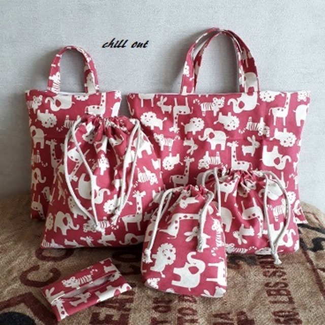 赤いリネンの動物園柄で入園バッグセットができました! とってもかわいらしいキャラクターで動物が描かれています。 生地もしっかりしています。 お洗濯をして使い込むごとに味が出そうな素材です。 可愛らしい6点セットをぜひどうぞ。 【セット内容:サイズ】 ①レッスンバッグ 縦30㎝ 横40㎝ ②靴袋 縦28㎝ 横17㎝ マチ5㎝ ③お着換え巾着 縦29.5㎝ 横25.5㎝ マチ5㎝ ④お弁当巾着 縦19.5㎝ 横21㎝ マチ4.5㎝ ⑤コップ巾着 縦20㎝ 横12.5㎝ マチ5㎝ ⑥ティッシュカバー 縦8㎝ 横12㎝ 6点セットなのでもう買い足す必要なし! 是非この機会にどうぞ。 端処理はロックミシンですのでお洗濯も安心、長くご愛用頂けます。 園児バッグ・通園バッグは人気商品のため、オーダーは承っておりません。 【ご注意】こちらの商品はハンドメイドです。 心を込めて作られたものを販売しておりますが、 サイズの誤差や差異等、ご了承ください。 色味に関しましてもできるだけ自然光にて撮影しております。 以上、既製品ではない旨、ご理解の上お買い上げください。 インスタやってます!☞https://www.instagram.com/chilloutonlyone #入園バッグ #入園バッグセット #5点セット #通園バッグ #通園バッグセット #通学バッグ #通学バッグセット #幼稚園 #保育園 #レッスンバッグ #靴袋 #お着換えバッグ #お弁当袋 #コップ袋 #手作り #ハンドメイド #世界に一つ #オリジナル #かわいい #かっこいい