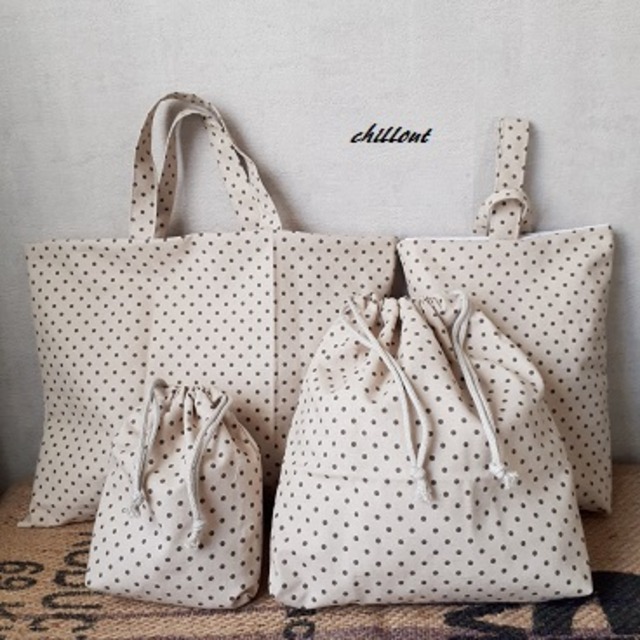 ハーフリネンのチャコールドット柄の入園バッグ4点セットが出来上がりました!