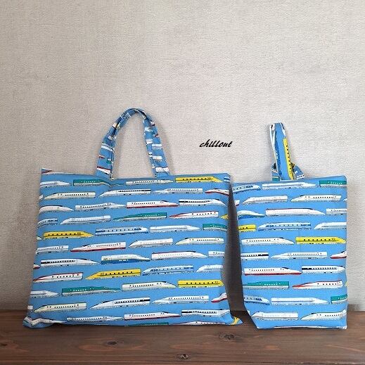 トレイン柄の入園バッグ5点セットが出来上がりました!