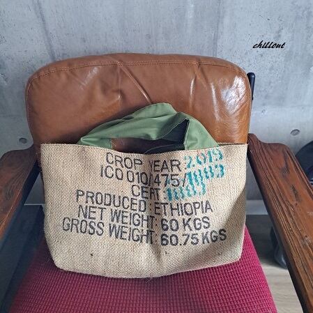 持手も個性的なコーヒー麻袋バッグが出来上がりました。