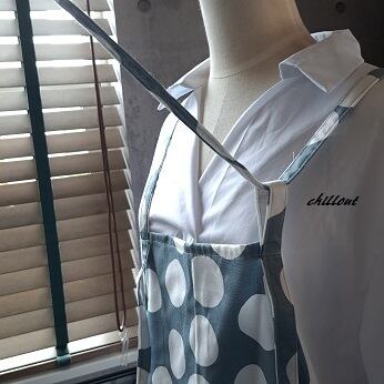 青みかかったグレードットのエプロンドレスが出来上がりました。
