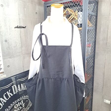 【背中がかわいい】マキシ:エプロンドレス:コットン:ブラック【0975】