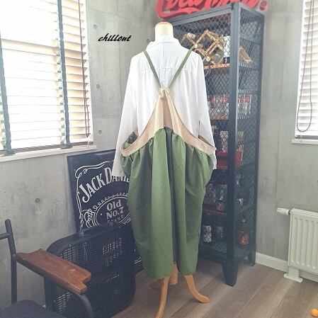 【背中がかわいい】マキシ:エプロンドレス:コットン:カーキ×リネン【0978】