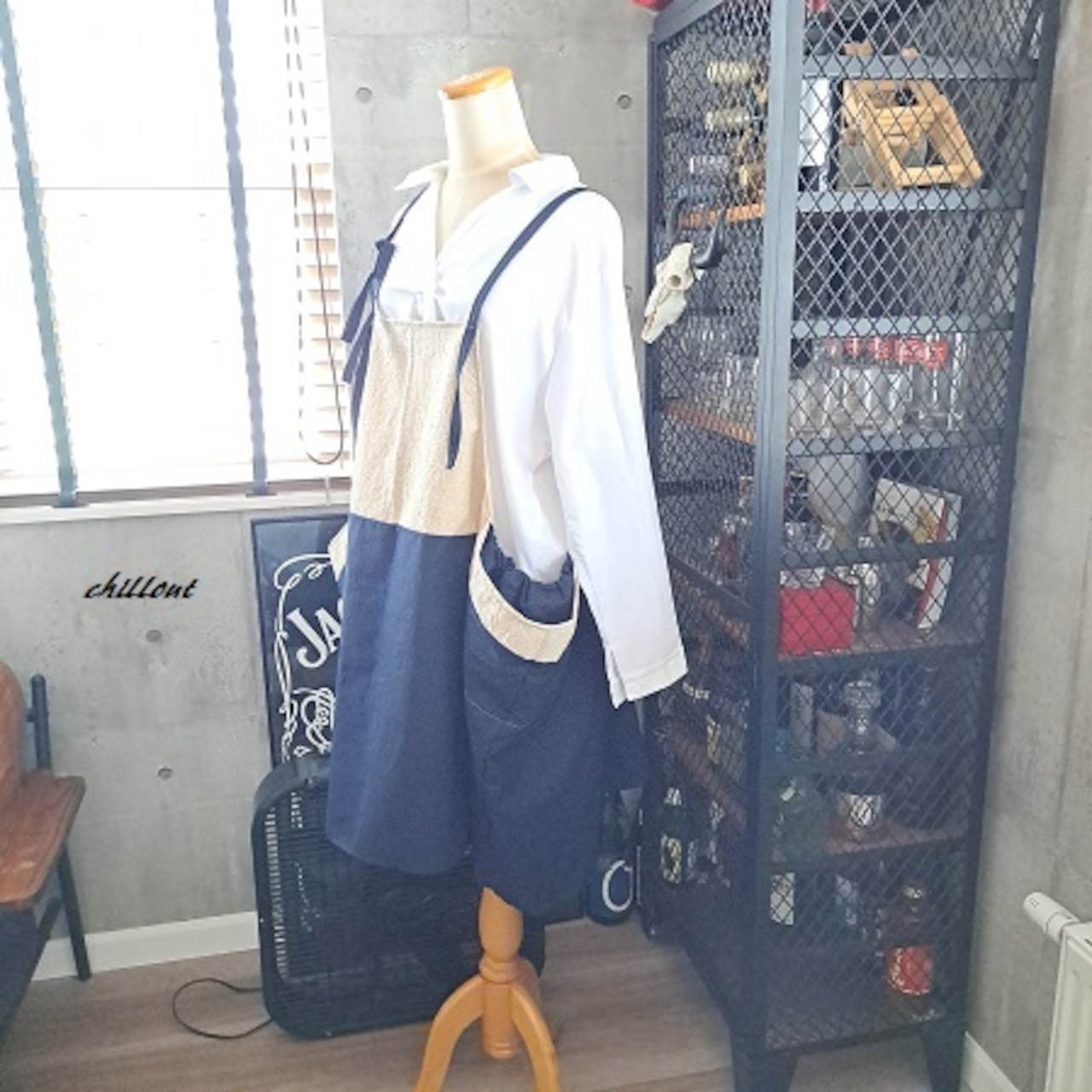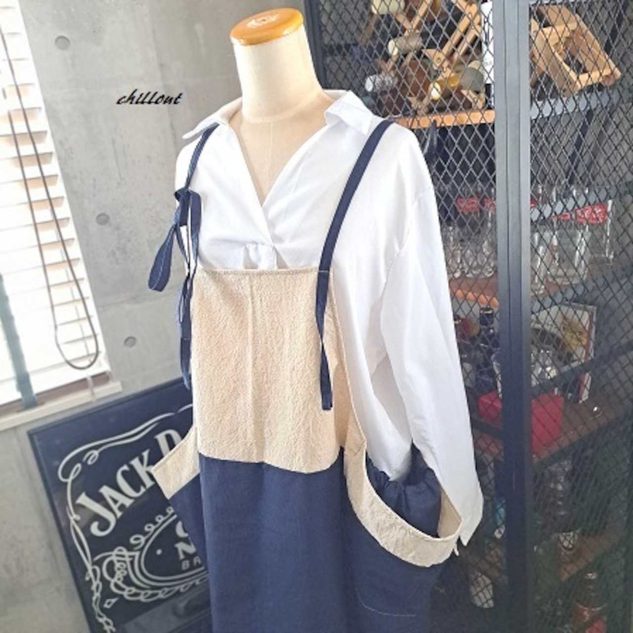 リネン×ネイビーの切替デザインエプロンが出来上がりました。