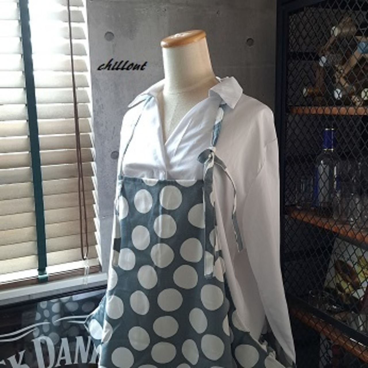 青みかかったグレードットのエプロンドレスが出来上がりました。