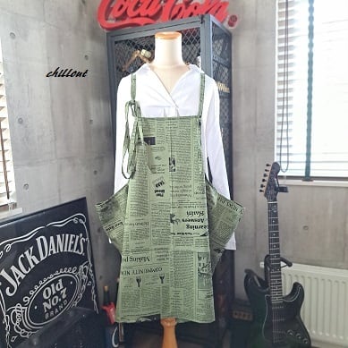 【背中がかわいい】エプロンドレス:英字新聞:グリーン:コットン【0799】