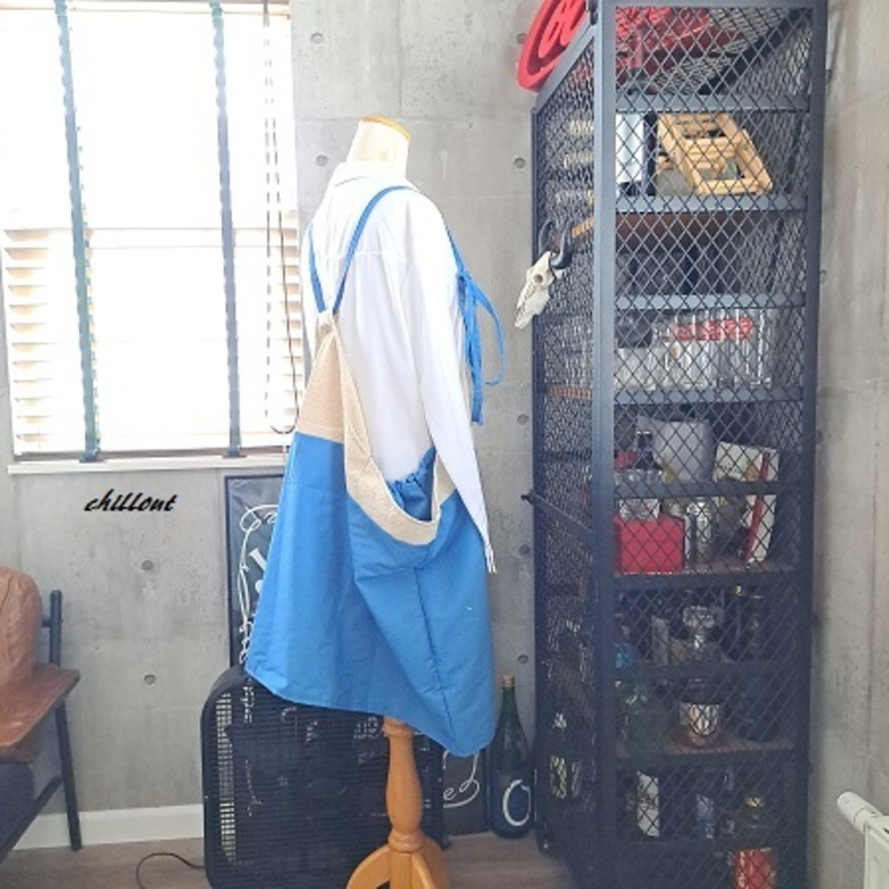 リネン×ブルーの切替デザインエプロンが出来上がりました。