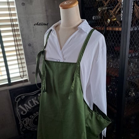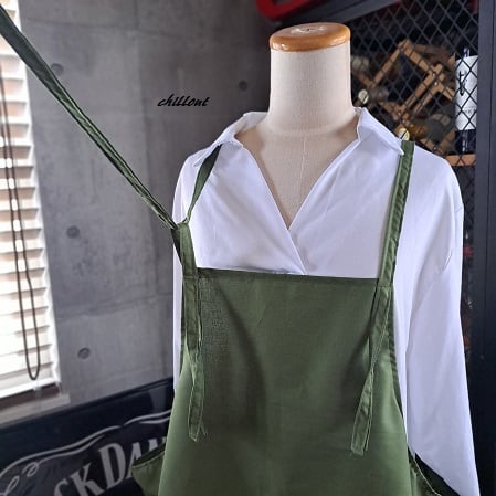 かっこよく着こなせるおしゃれなモスグリーンのエプロンをぜひどうぞ。