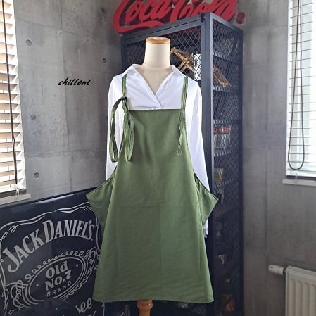 【背中がかわいい】エプロンドレス:コットン:オリーブ【0891】