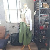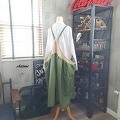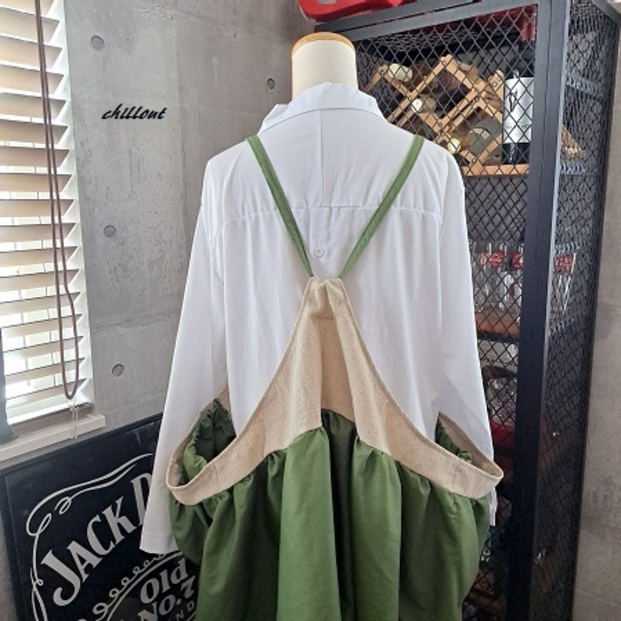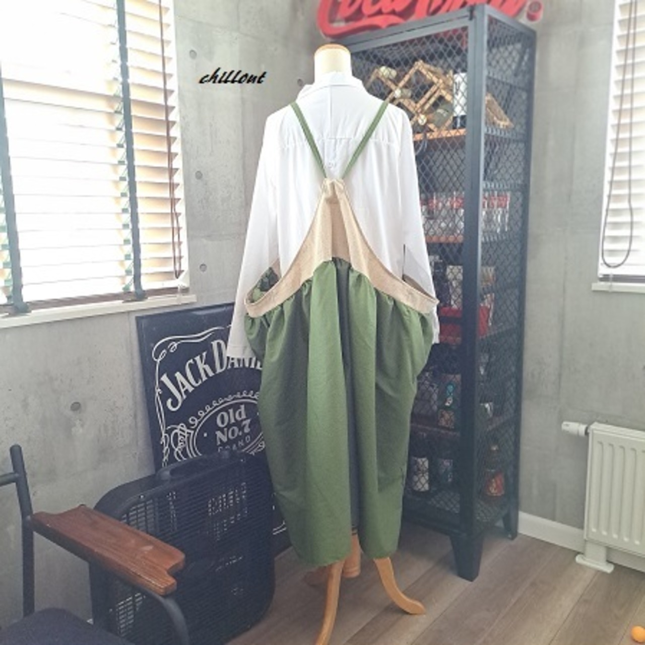 【背中がかわいい】マキシ:ギャザー:エプロンドレス:コットン:カーキ×リネン【0978】
