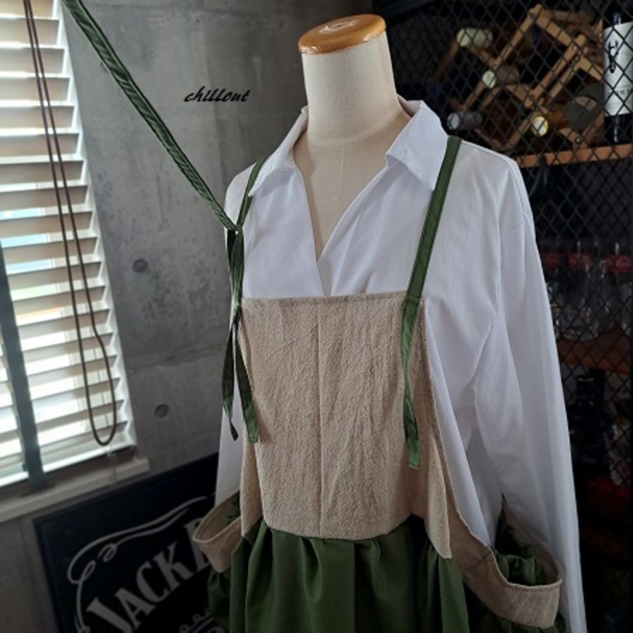 品よくおしゃれに着こなせるおしゃれなカーキ×リネンのエプロンをぜひどうぞ。