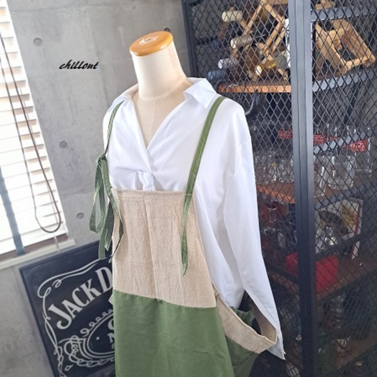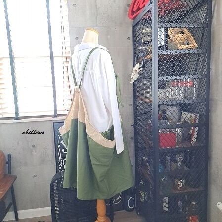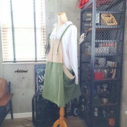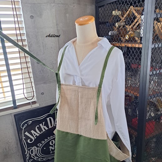 リネン×カーキの切替デザインエプロンが出来上がりました。