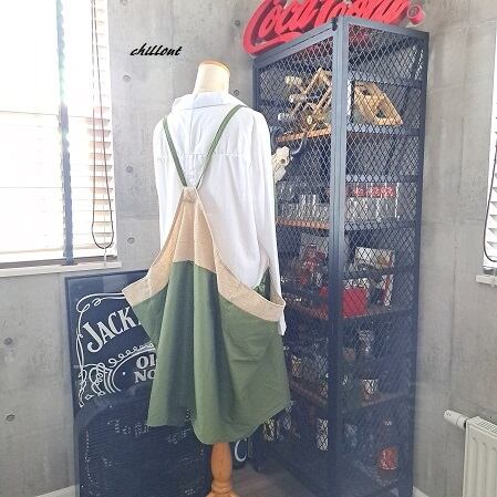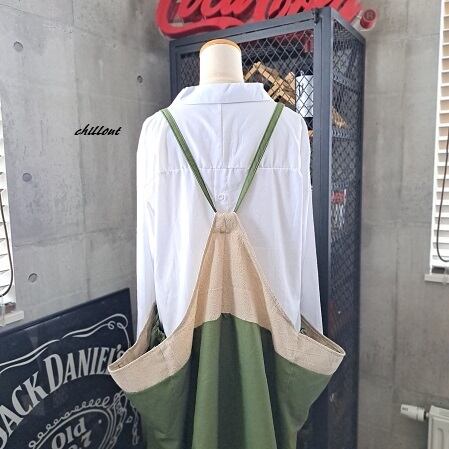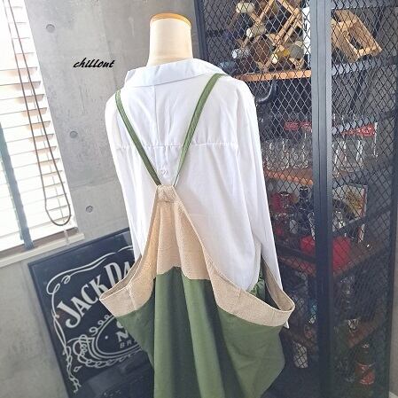 【背中がかわいい】エプロンドレス:リネン×カーキ【0995】