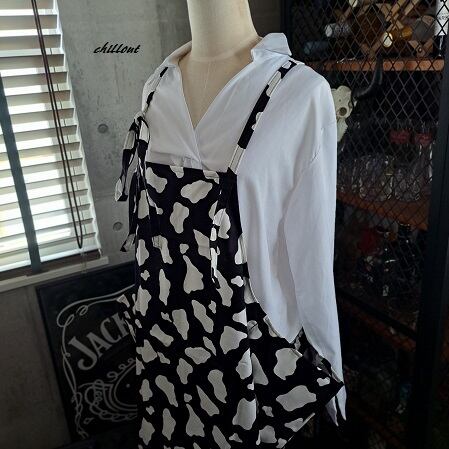 【背中がかわいい】エプロンドレス:牛柄:ブラック:コットン【0902】