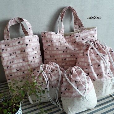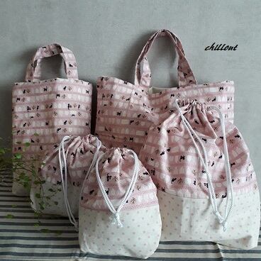 とってもかわいいピンクの猫柄の切替デザインの入園5点セットです。