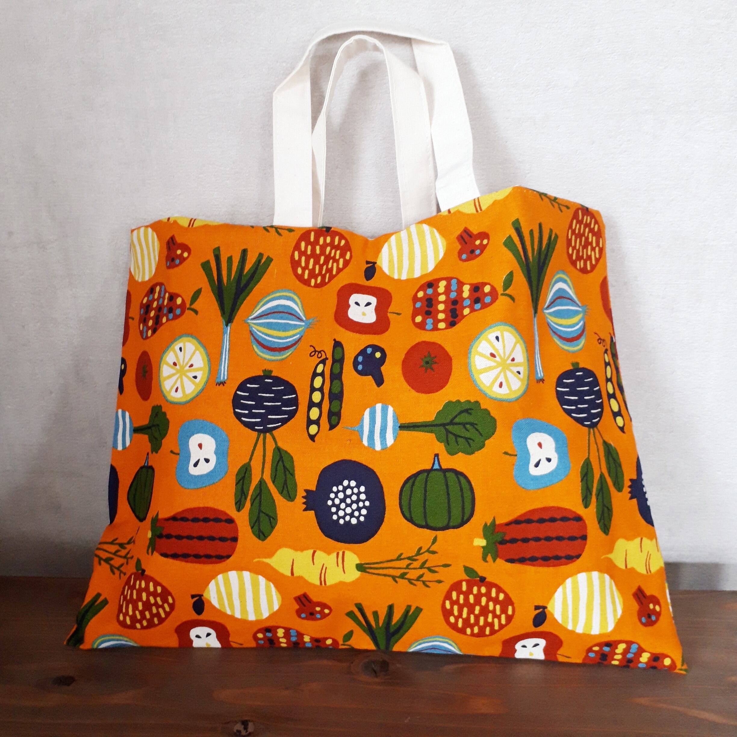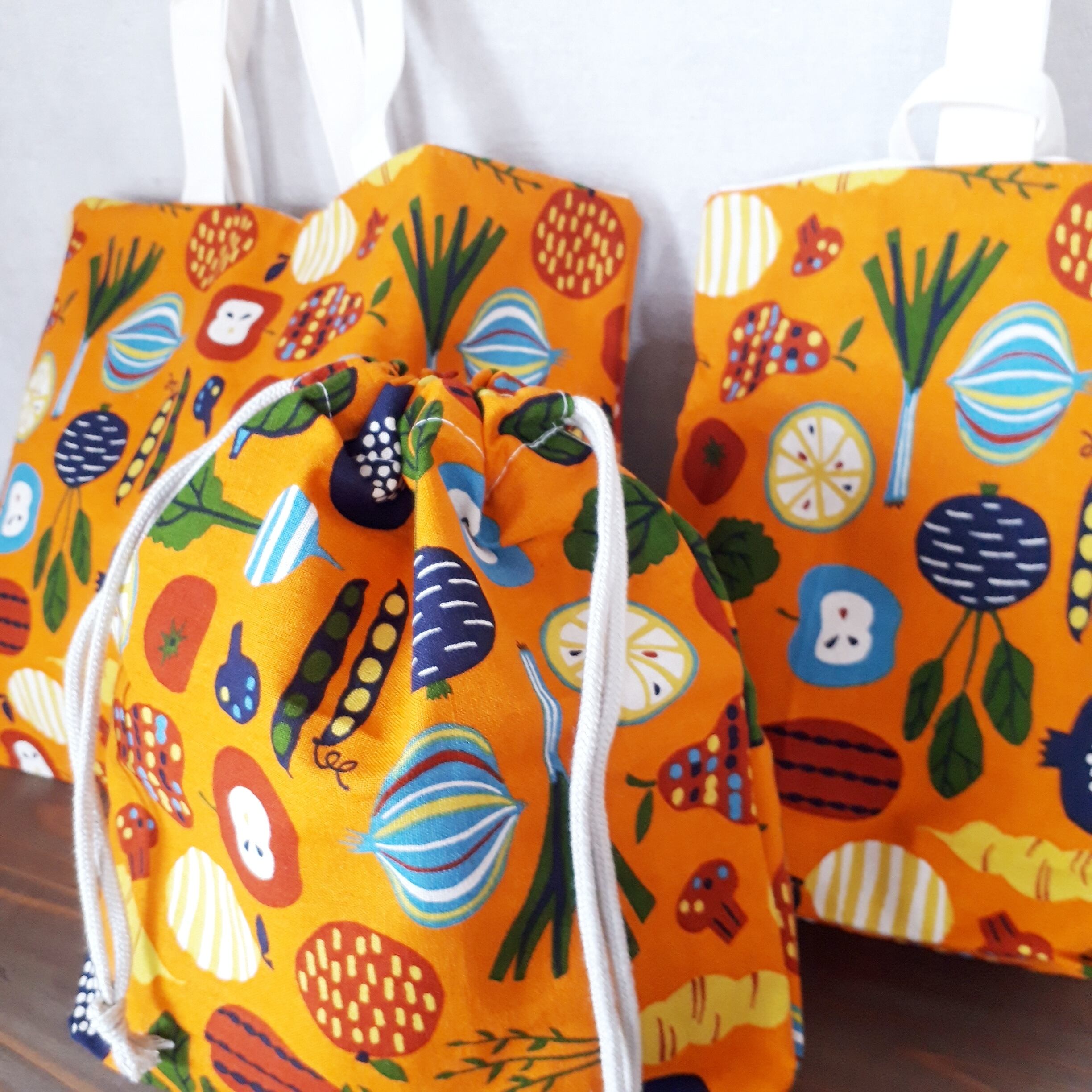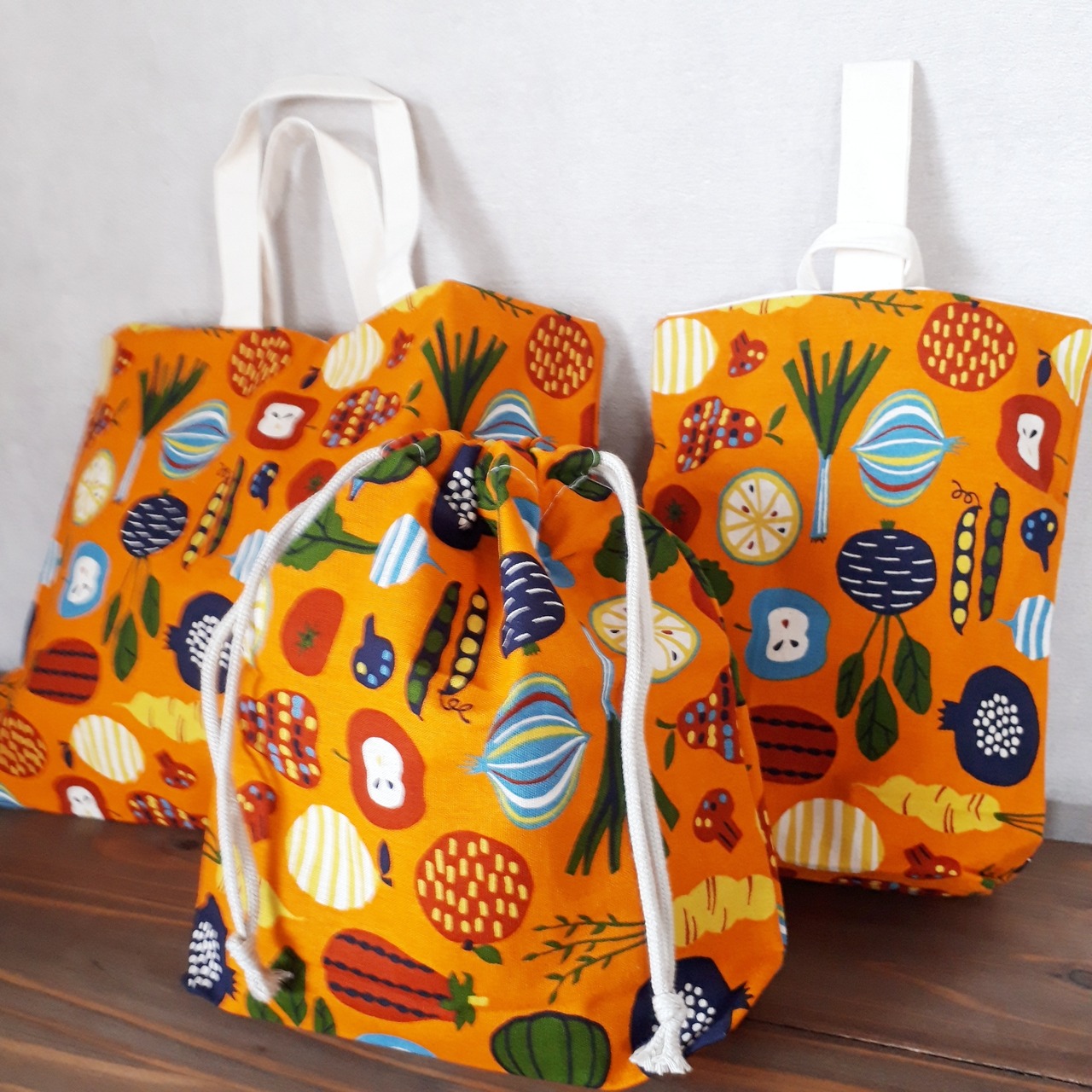 ポップなオレンジ色のフルーツバスケット柄の入園バッグセットが出来上がりました!