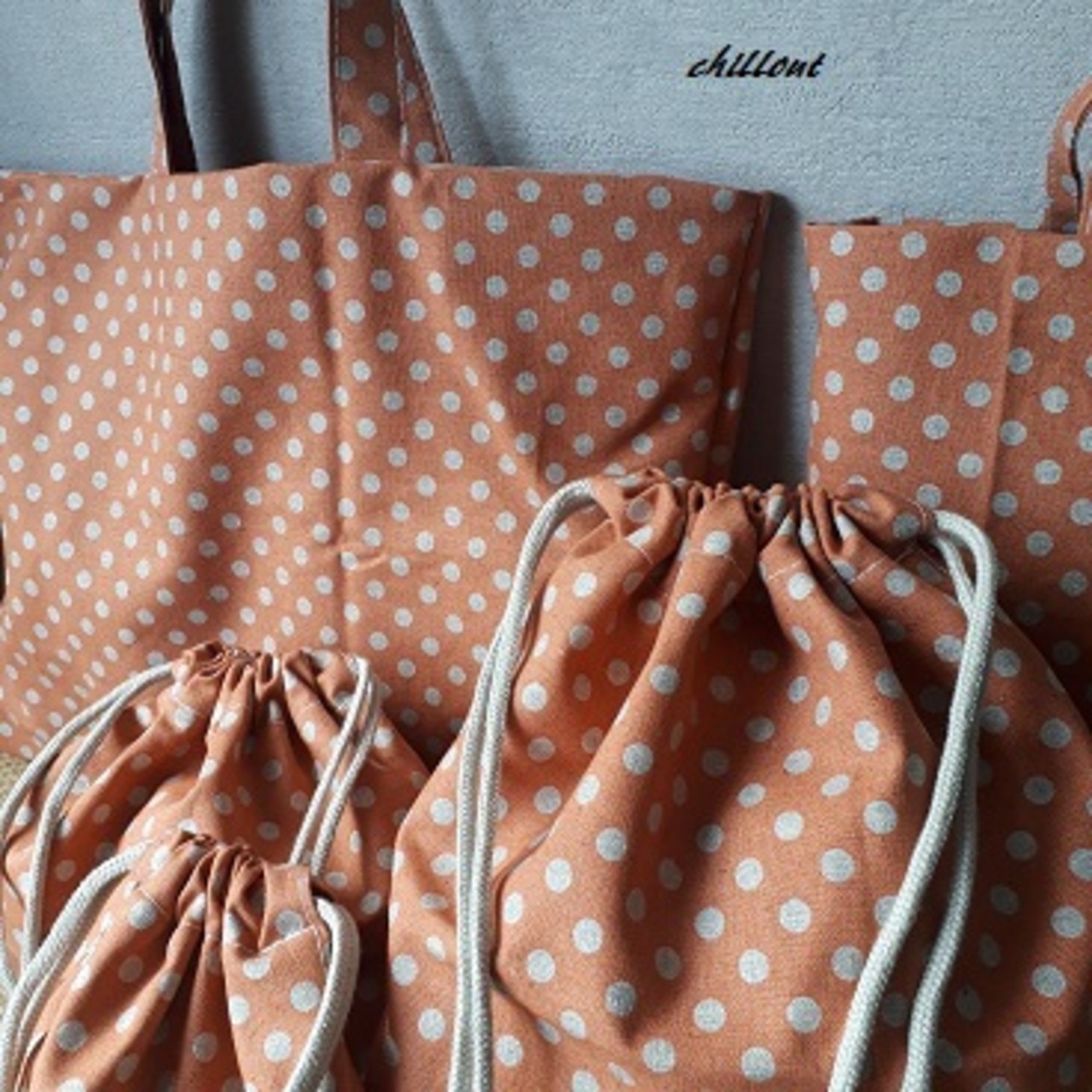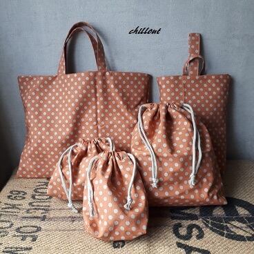 オレンジにラメのドット柄の入園バッグ5点セットが出来上がりました!