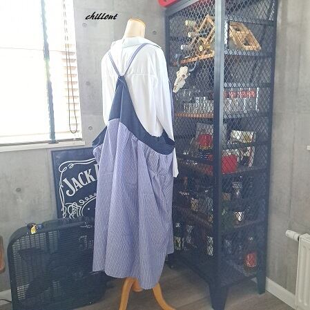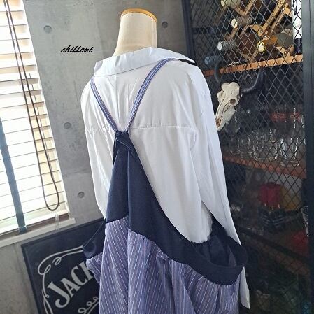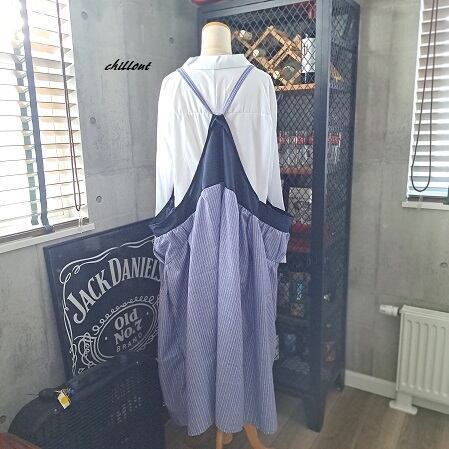 【背中がかわいい】マキシ:ギャザー:エプロンドレス:ネイビー×ストライプ【1017】