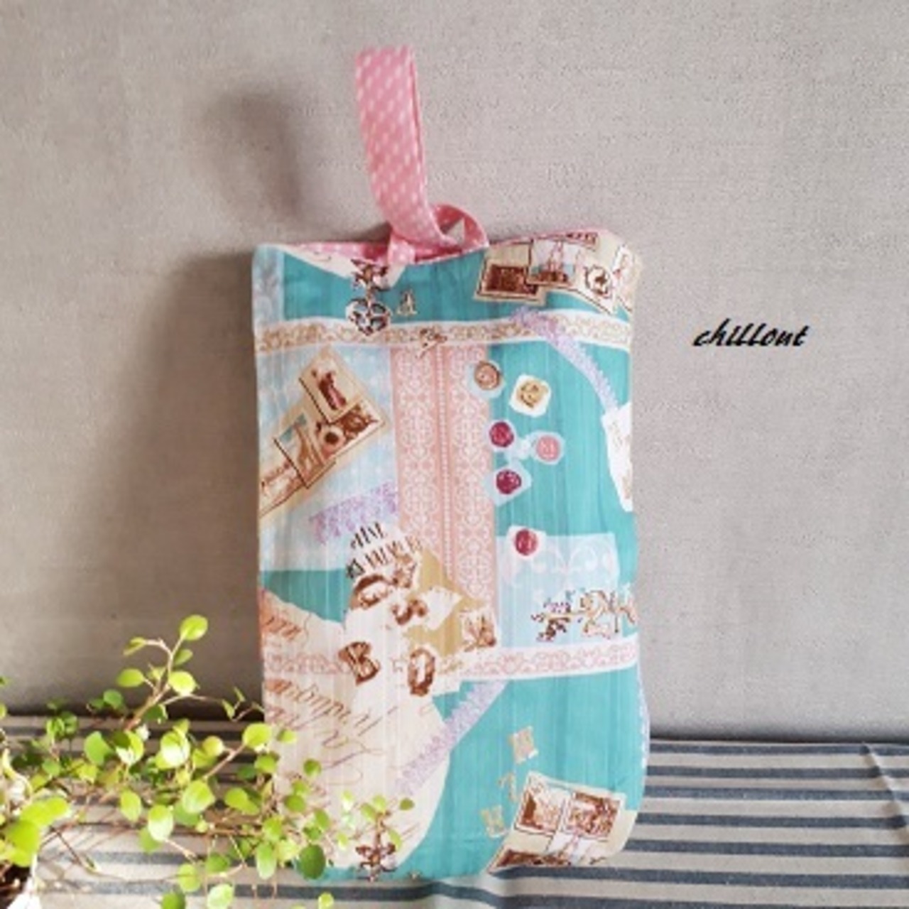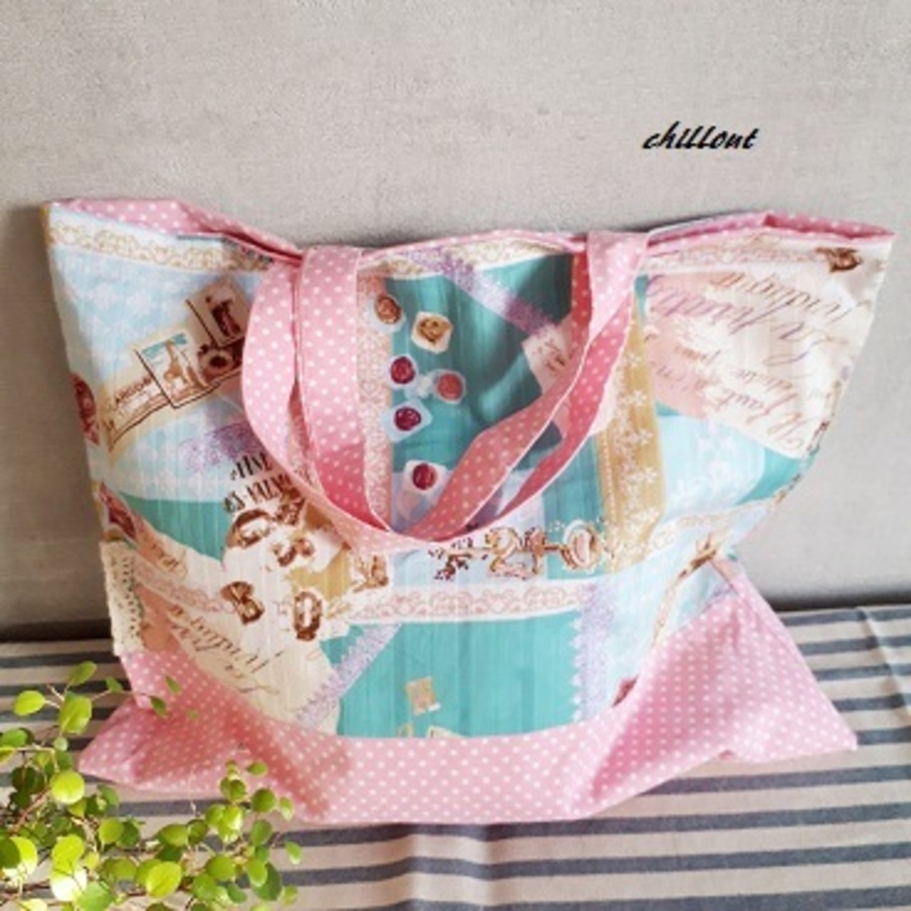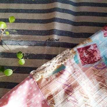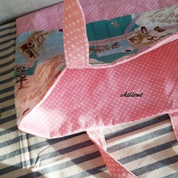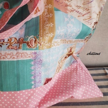 水色のコラージュ柄にピンクのドットの切替のセットです。