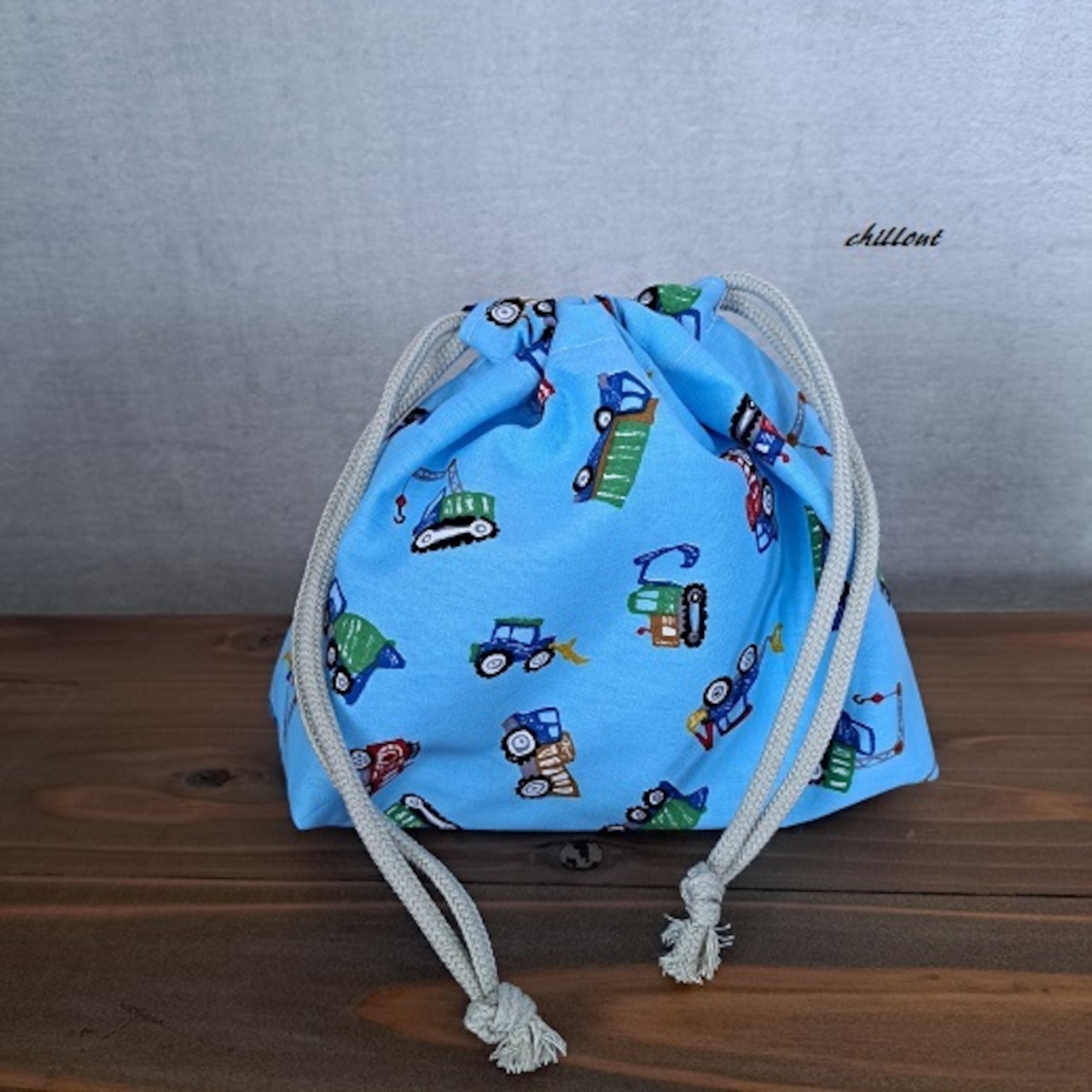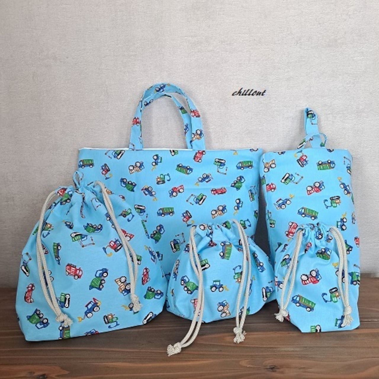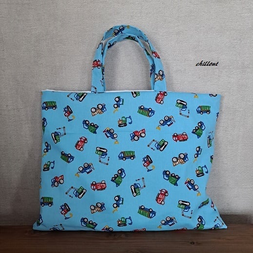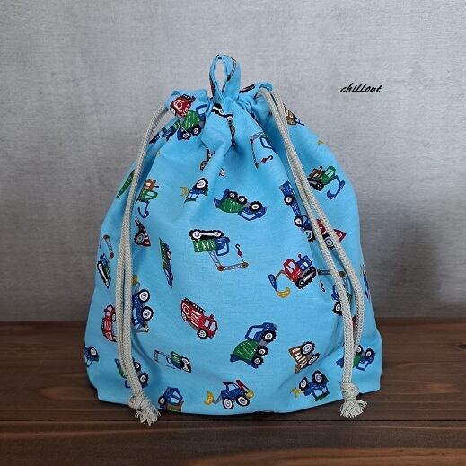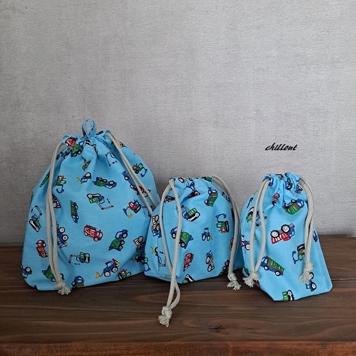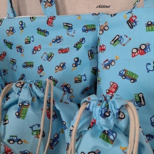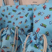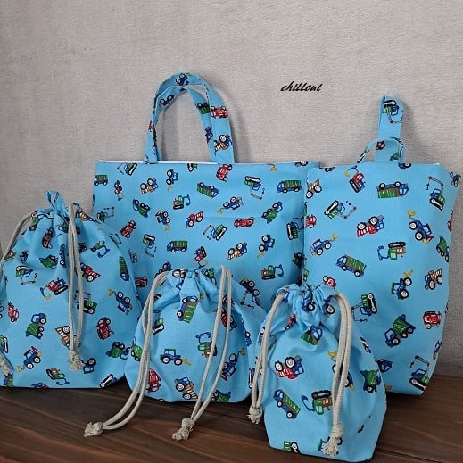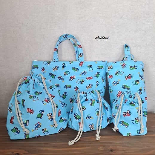 働く車柄の入園バッグ5点セットが出来上がりました!