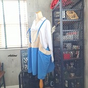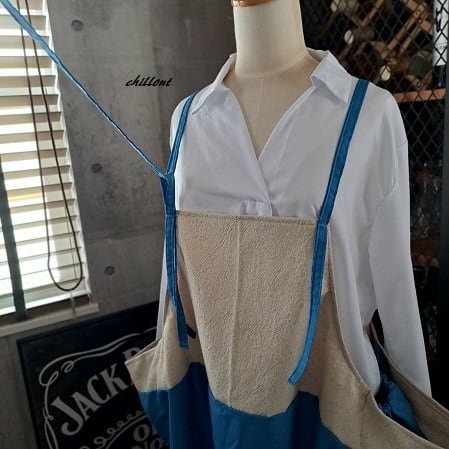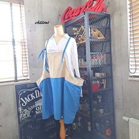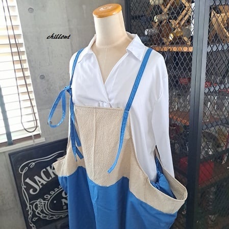 リネン×ブルーの切替デザインエプロンが出来上がりました。