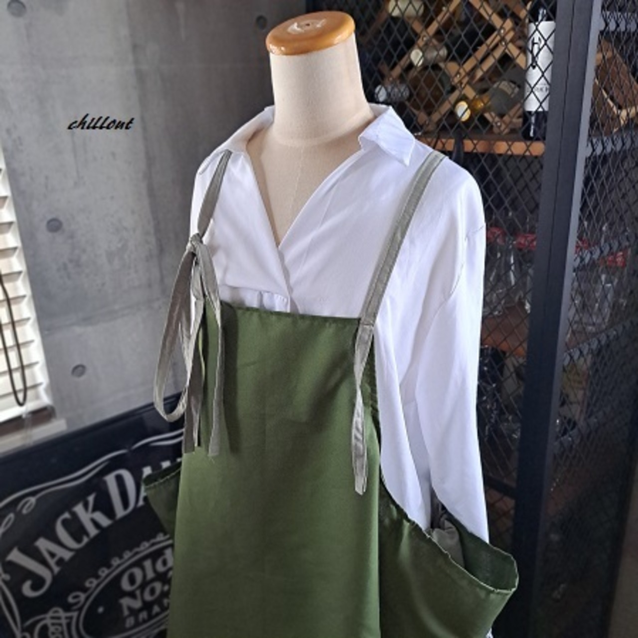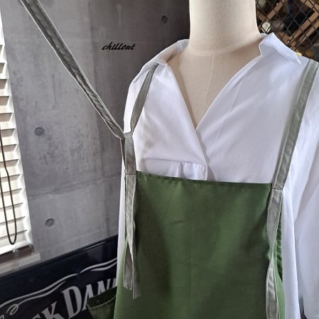 かっこよく着こなせるおしゃれなオリーブ×ライムグレーのエプロンをぜひどうぞ。