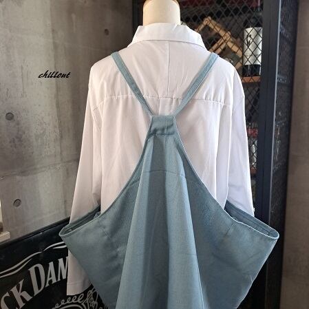 スカイブルー色のデニムデニのエプロンが出来上がりました。