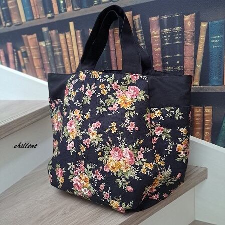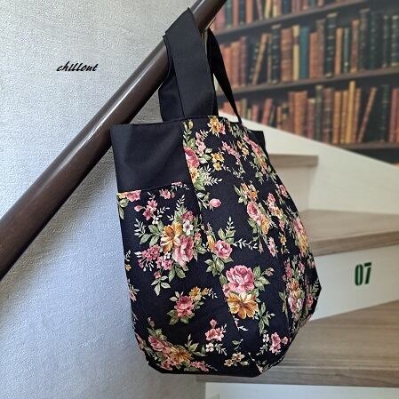 【ビッグトートバッグ】花柄×ブラック:サイドポケット【1054】