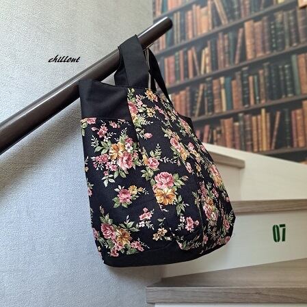 花柄×ブラックの大きなトートバッグが出来上がりました。