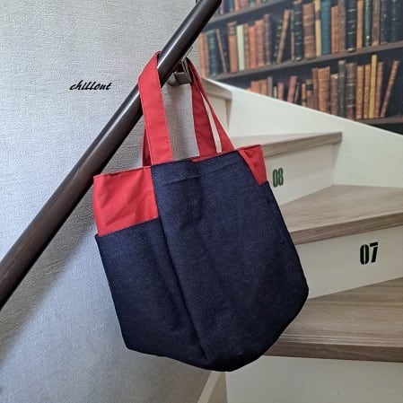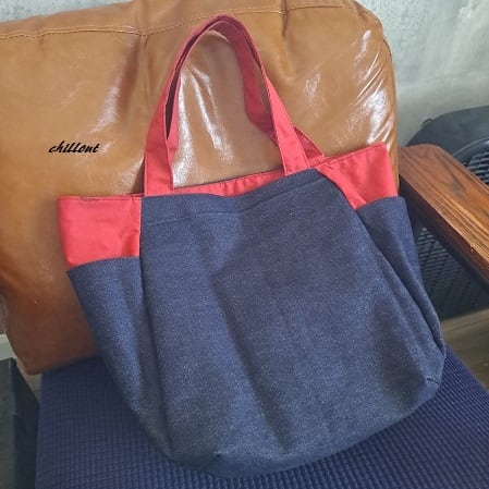 デニム×レッドの大きなトートバッグが出来上がりました。