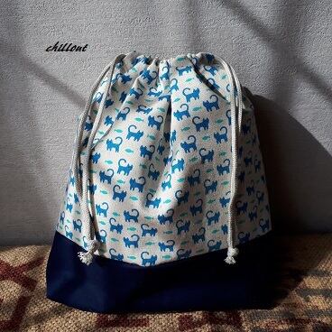 【ソフトリネン】入園バッグ7点セット:青い猫の切替セット【0075】