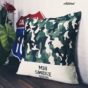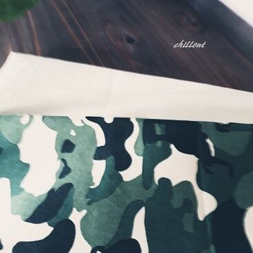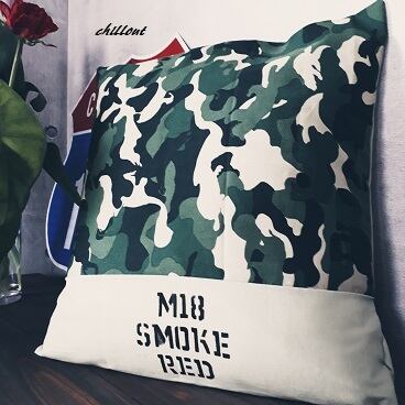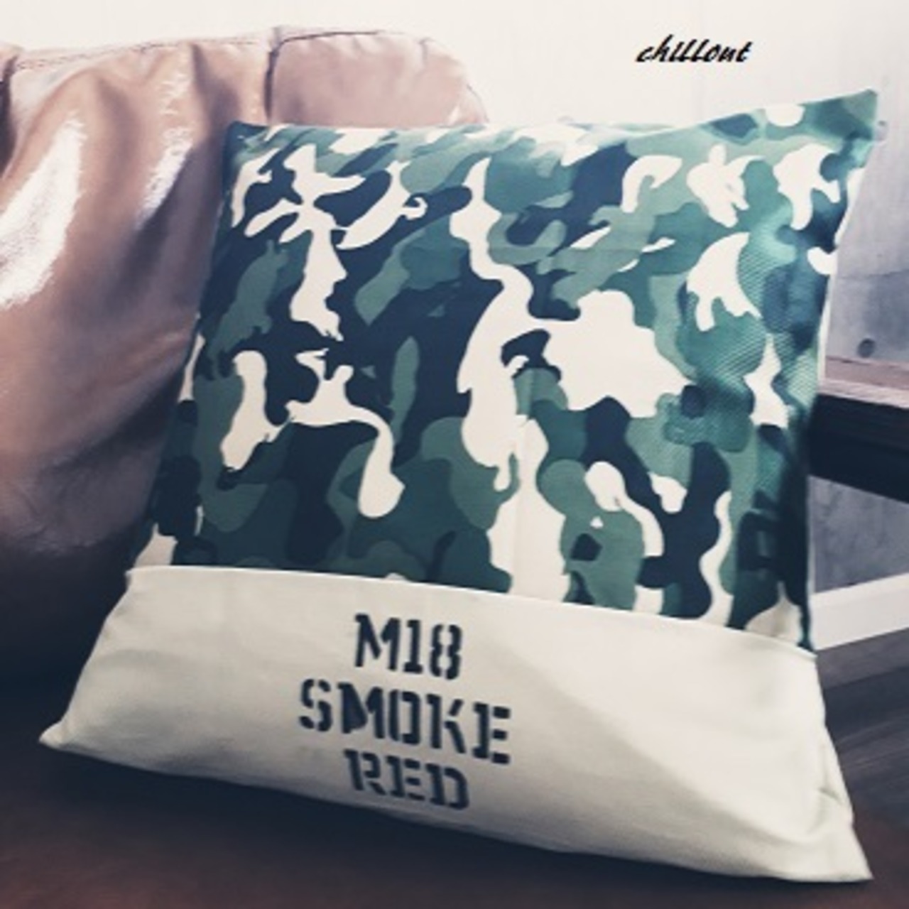 くつろぎを演出するクッションカバーにミリタリーステンシルを施しました。