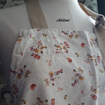 ピノキオ柄のリネンで作ったホルダーネックエプロンです。
