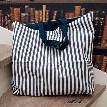 表面はコーヒー麻袋、裏面は紺色ストライプの混麻生地。