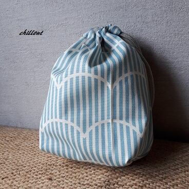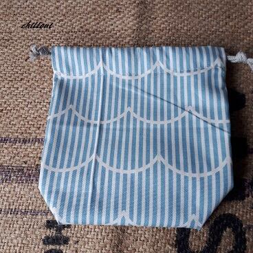 水色ボーダーの巾着が出来上がりました。
