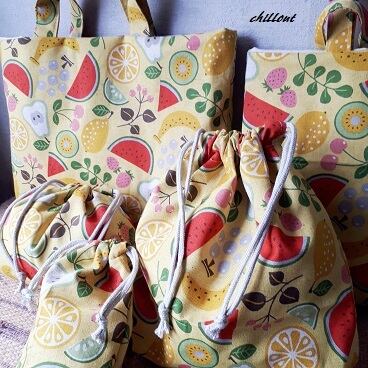 北欧デザインでポップなフルーツバスケットの入園バッグ5点セットが出来上がりました!