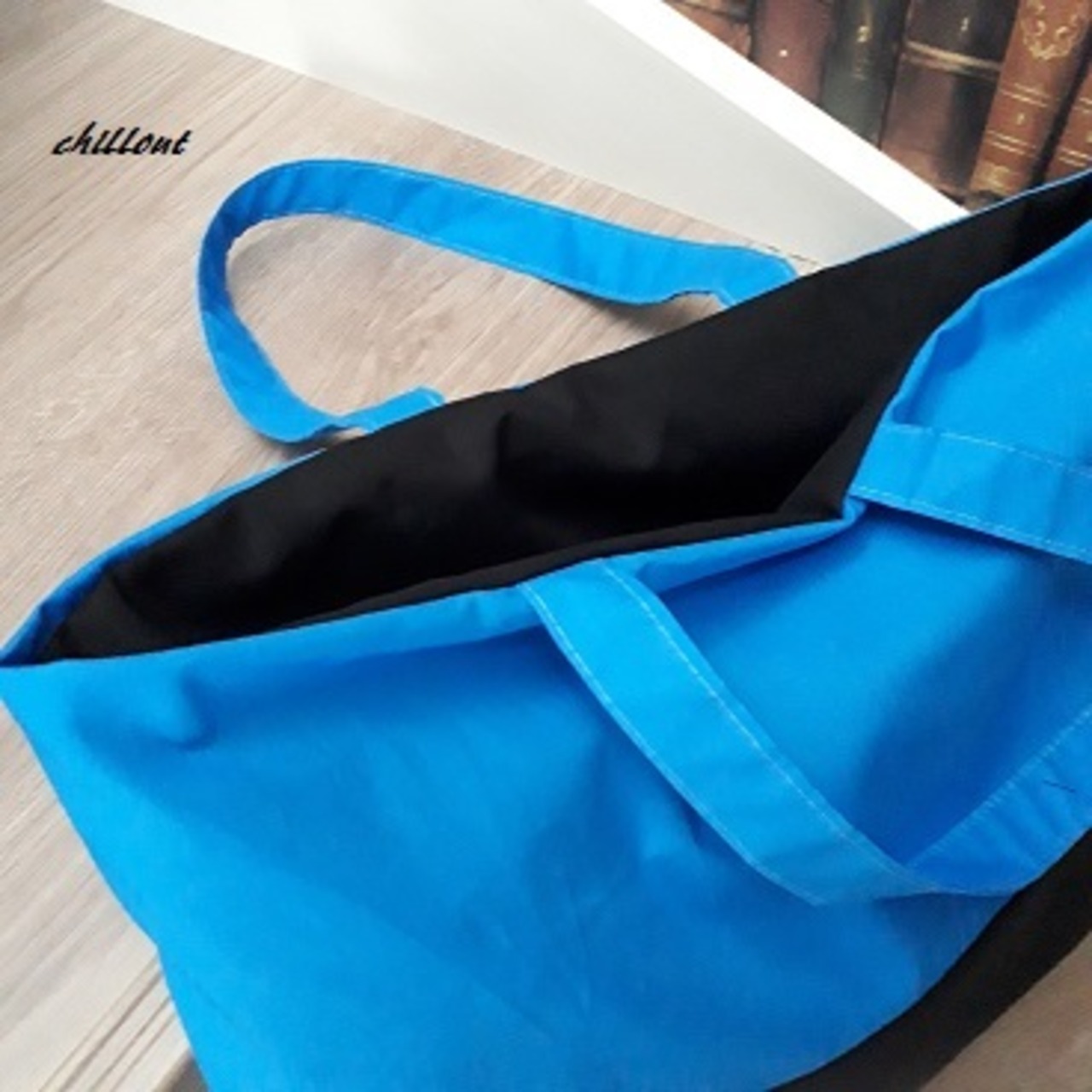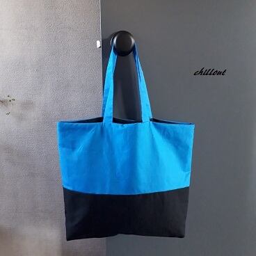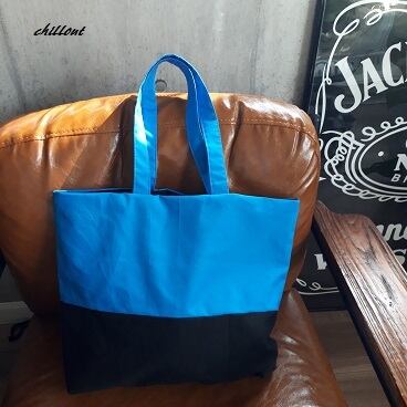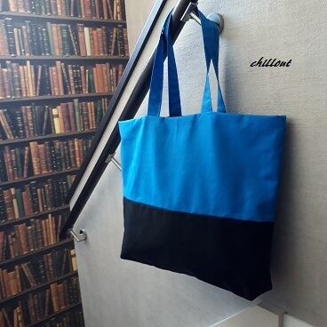とてもきれいなブルーとブラックの切りかえトートバッグが出来上がりました。