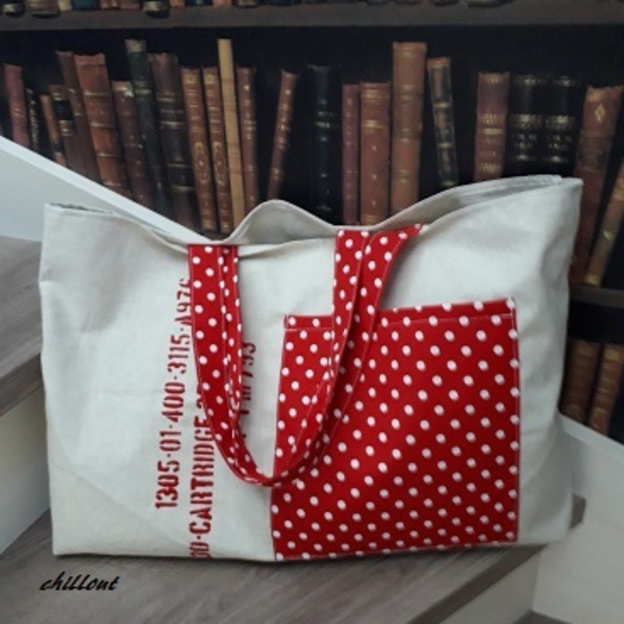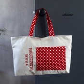 ナチュラルなリネンに大きなレッドドットのポケット×持手。