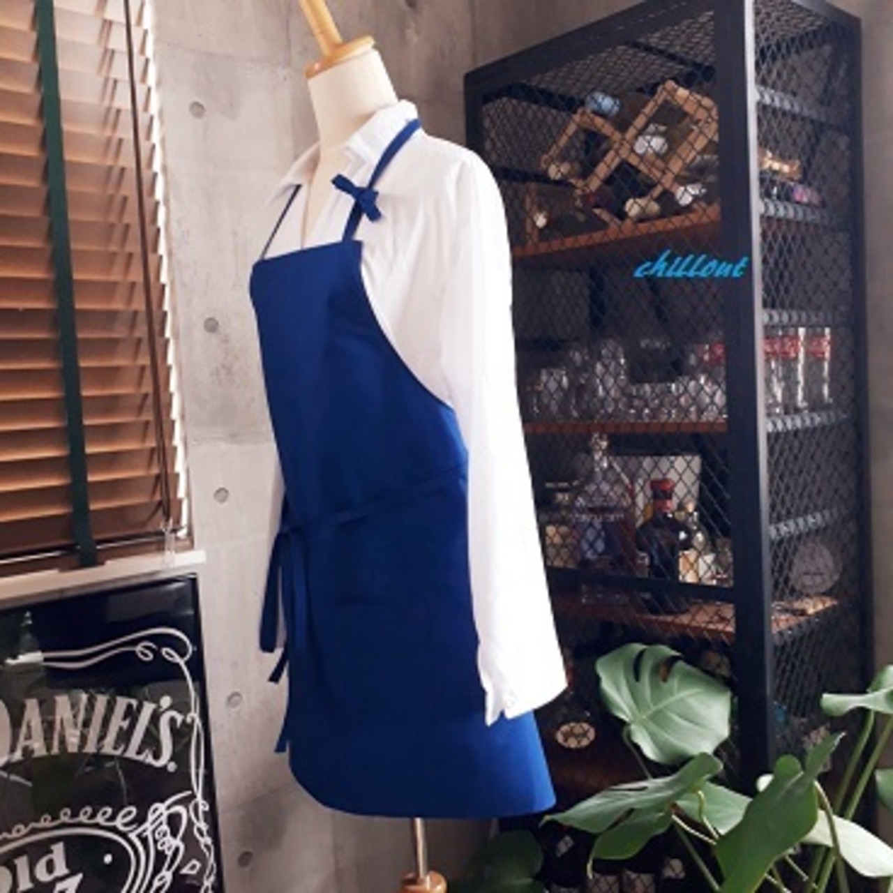 爽やかなブルーハワイ色のカフェエプロンはとても人気のデザイン。