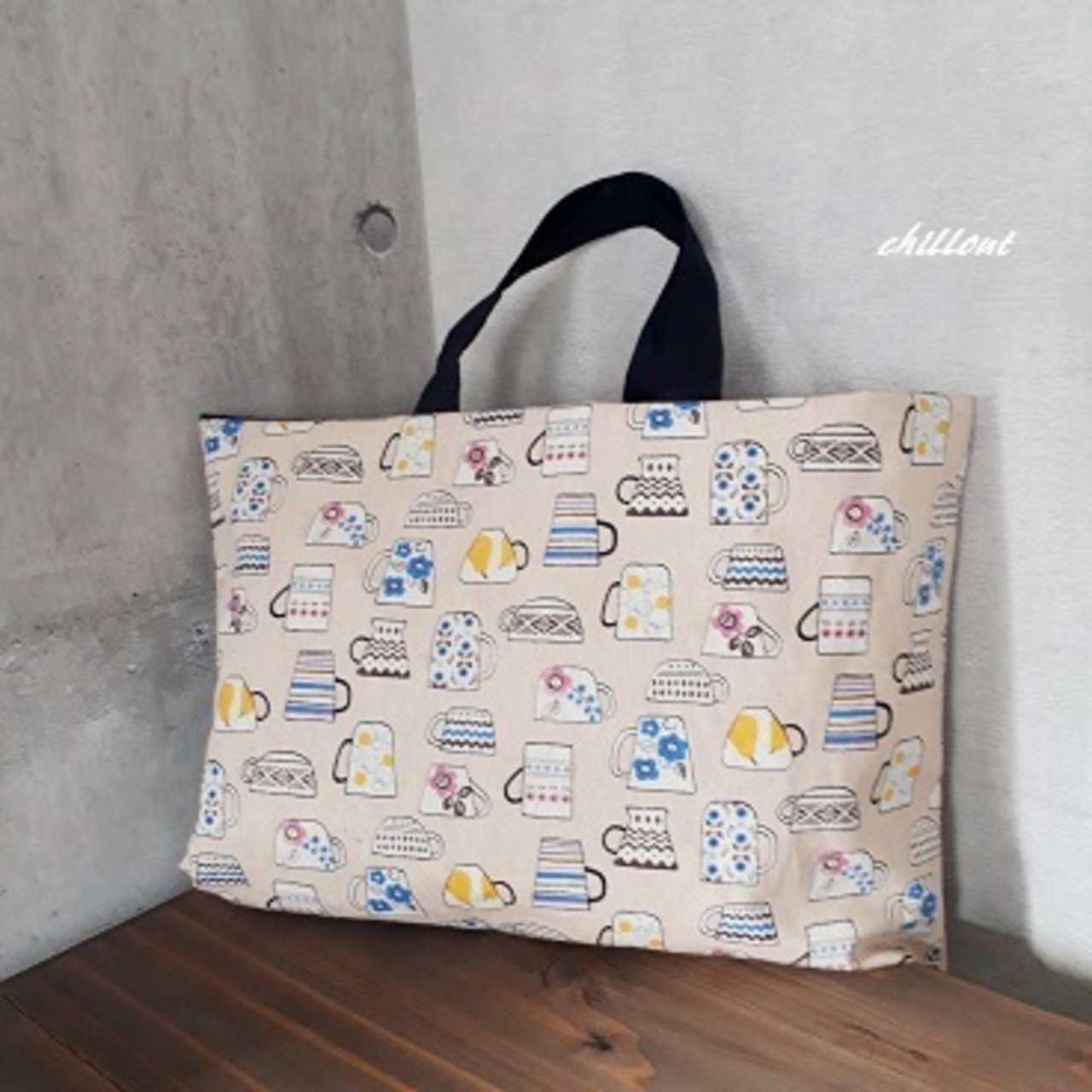 ミルクティー色のティーカップ柄の入園バッグ3点セット。