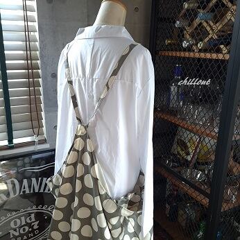 濃い目のグレードットがおしゃれなスタイルアップエプロンが出来上がりました。