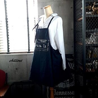 ネイビー×ステンシルの存在感のあるカフェエプロンをどうぞ。