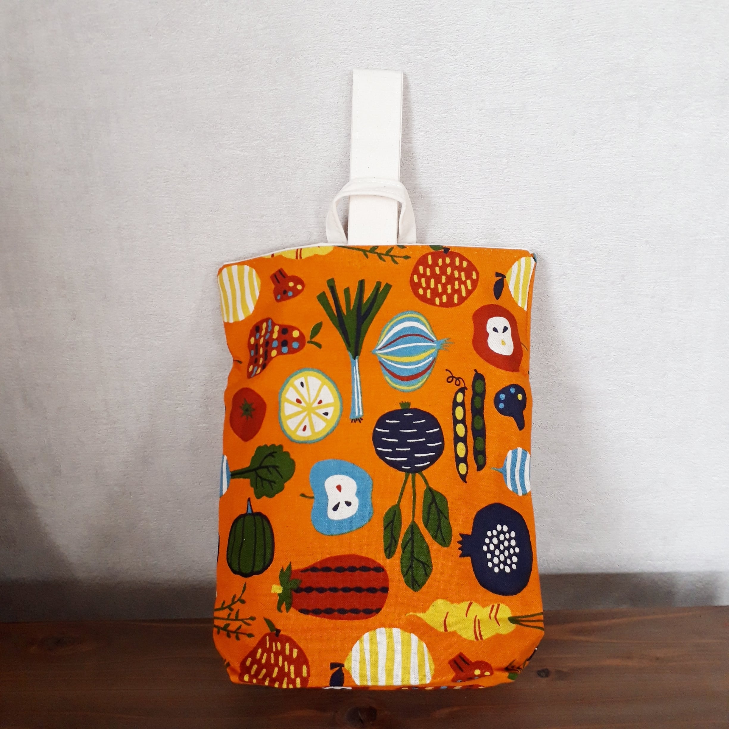 ポップなオレンジ色のフルーツバスケット柄の入園バッグセットが出来上がりました!