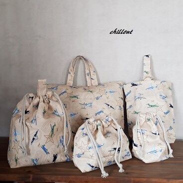 飛行機柄の入園バッグ5点セットが出来上がりました!
